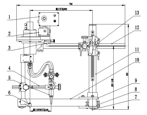 標準型CG2-600割圓機,其標配有一把割炬。“CG2-600”型半自動割圓機采用鋁合金鑄造而成,輕巧便攜。機械兩檔變速,調速系統采用可控硅觸角調速,運行速度平穩。機身底腳裝有滾輪,移動方便。本裝置通過其底座上三個支撐點放置在被切割鋼板上。電機通過減速箱變速,帶動中心軸作旋轉運動進行切割,割圓半徑根據需要可調節,也可在鋼板豎直和角度擺放情況下進行切割。使用該割圓機可提高工效、保證切割質量有效減輕工人的勞動強度。本機采用兩檔變速,調速系統采用可控硅觸角調速,調節精確。割炬總路設有總閥,切割同厚度的鋼板只需調整火焰一次,以后無需再調整。本裝置配有氣體旋轉分配器,膠管不纏繞。本裝置,有效減少了勞動時間,降低了工人的勞動強度,一定程度地提高了工作效率。
