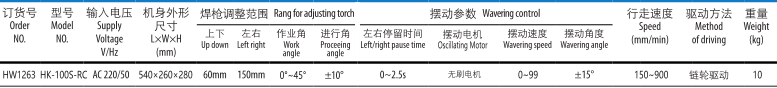 該機(jī)具有擺動(dòng)功能,有不同規(guī)格的焊道方式可供選擇,以獲得最佳的焊接效果。擺動(dòng)速度,擺動(dòng)角度,中心偏移位置和左右停留時(shí)間均可方便的調(diào)整,數(shù)碼管顯示各種調(diào)整數(shù)據(jù)。較寬的軌道讓整臺(tái)機(jī)器的重心更穩(wěn)定,軌道下裝有帶開(kāi)關(guān)的永磁磁鐵,安裝移動(dòng)更方便。驅(qū)動(dòng)部分安裝了手動(dòng)離合裝置,方便機(jī)器在軌道上快速定位,導(dǎo)輪也配有離合裝置,可以很方便的進(jìn)行小車(chē)與導(dǎo)軌之間安裝與拆卸。可以進(jìn)行垂直角焊和水平角焊,適用于加強(qiáng)件等的交叉部位的焊接。焊接不銹鋼或鋁材,可選用真空吸盤(pán)導(dǎo)軌。無(wú)線遙控操作更加省心省力,注:標(biāo)配二根長(zhǎng)度為2米的柔性導(dǎo)軌。
