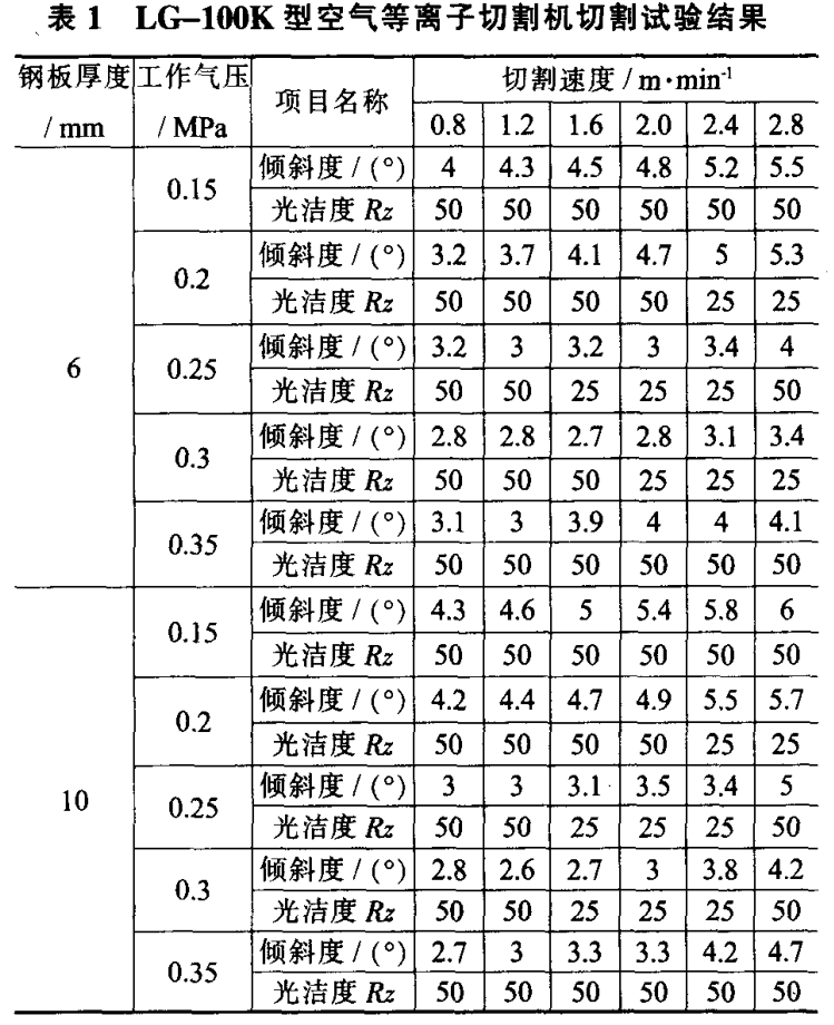 用數(shù)控等離子切割機(jī)可以切割各種形狀復(fù)雜的工件,并具有切割速度快、效率高、切割面質(zhì)量好、切割尺寸精確、工件熱變形小等優(yōu)點(diǎn)。切割的零件不需機(jī)械加工就可直接進(jìn)行焊接和應(yīng)用。但數(shù)控等離子切割機(jī)是用等離子弧進(jìn)行切割,它與氧氣切割相比.仍有一定的缺陷,主要體現(xiàn)在切割面的傾斜度較大,光潔度沒有氧氣切割的好。評定數(shù)控等離子切割質(zhì)量好壞的主要判據(jù)是:切割面的傾斜度、切縫的割紋深度、掛渣多少等。一個(gè)優(yōu)質(zhì)的切割面其傾斜度應(yīng)在30以下,割紋深度應(yīng)在O.15 mm以下,且掛渣少,容易清除。在電壓、電流穩(wěn)定的條件下,影響切割質(zhì)量的因素除了電極、噴嘴本身質(zhì)量以外,主要還有二個(gè)方面的原因:一是割嘴高度與穩(wěn)定;二是切割速度與工作氣壓的匹配。割嘴離鋼板的高度當(dāng)采用弧壓調(diào)高器來控制時(shí),因其動態(tài)定位精度可達(dá)±0.013姍,所以能保證割嘴與鋼板的高度保持不變,故切割面的傾斜度小而均勻,且光潔度好。當(dāng)用手工來調(diào)節(jié)割嘴離鋼板的高度時(shí)。被切鋼板要盡量放平,以減少割炬的調(diào)節(jié)次數(shù)。保證割炬切割過程中的穩(wěn)定。本文采用手工調(diào)節(jié)方式,將割嘴離鋼板的高度控制在6~8 mm,通過一系列的切割試驗(yàn),闡述了切割速度(穢)、工作氣壓(P)與切割質(zhì)量的關(guān)系。