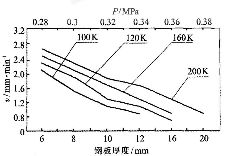 從表1結(jié)果可看出,當(dāng)切割速度過高、氣壓過低時(shí),切割面的傾斜度大。這是因?yàn)樗俣冗^快,弧柱嚴(yán)重后傾,割縫下半部熔化速度跟不上。所以切割的零件上平面尺寸小。下平面尺寸大,尤其是切割直角形的零件時(shí).在拐角處的底部割縫成圓弧形而不是直角形。如果切割速度過低、氣壓過高則掛渣嚴(yán)重,不易清除,光潔度較差。如果切割速度合適,工作氣壓過高,弧柱的挺度和圓滑度受到破壞,切割能力下降.切割光潔度差。所以,切割不同厚度的鋼板,需要合理地選擇不同的切割功率、切割速度和工作氣壓,才能得到最佳的切割效果。從表1數(shù)據(jù)還可看出,不同的鋼板厚度有不同的最佳切割速度和工作氣壓。我們根據(jù)四種不同型號機(jī)型的試驗(yàn)數(shù)據(jù)進(jìn)行分析和整理,繪制出了用不同功率的等離子切割機(jī)切割不同厚度鋼板的最佳切割速度與工作氣壓參數(shù)曲線圖,如圖1所示。
