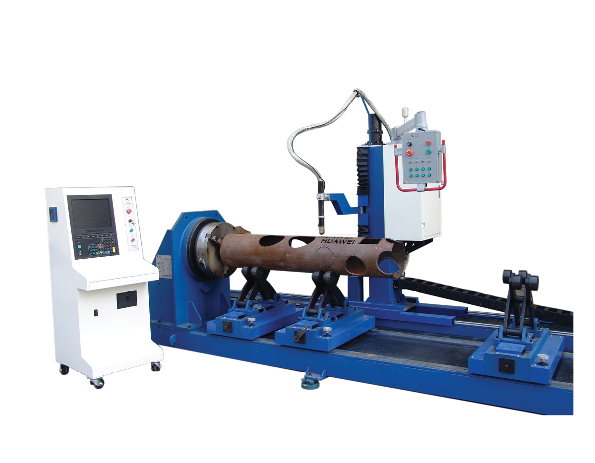 XG-630數控相貫線切割機由動力旋轉頭、切割頭和控制系統及移動機架等組成。通過移動機架使得運行導軌與托架導軌保持平衡,進而調高了機器的切割精度。動力旋轉頭通過卡盤帶動工件的旋轉。切割頭帶有割嘴,并配有自動點火裝置,用于切割管材,它可以軸向和徑向運動。通過控制系統控制以上運動軸的聯動,最終實現鋼管相貫線的切割。